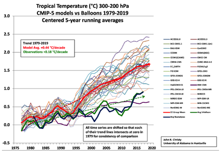However, the average model over the same period as UAH shows a rate of +2.15C/cent. Moreover, for the 30 years from 2006 to 2035, the warming rate is projected at 2.28C. These estimates are in contrast to the 145 years of history in the models, where the trend shows as 0.41C per century.