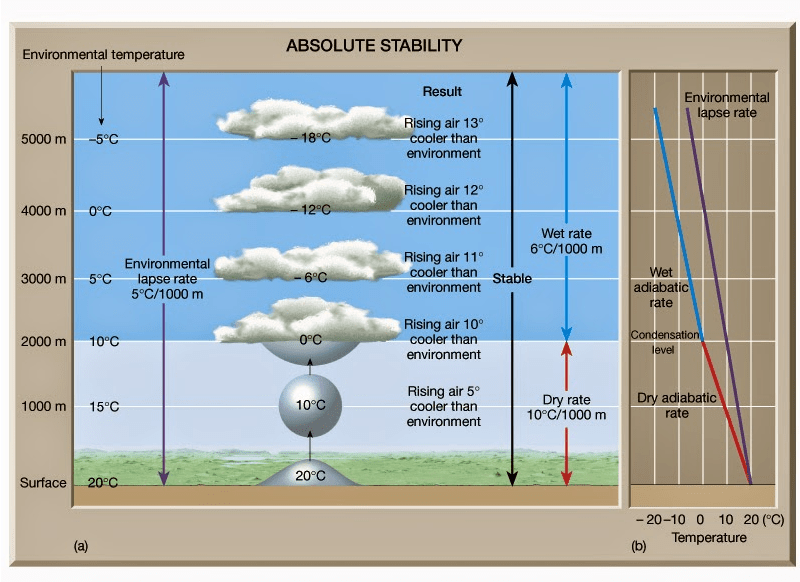 Air circulation without condensation (A) and with condensation (B). Gray squares are the air volumes, which in case (B) contain water vapor shown by small blue squares inside gray ones. White squares indicate those air volumes that have lost their water vapor owing to condensation. Blue arrows at the Earth’s surface represent evaporation that replenishes the store of water vapor in the circulating air.