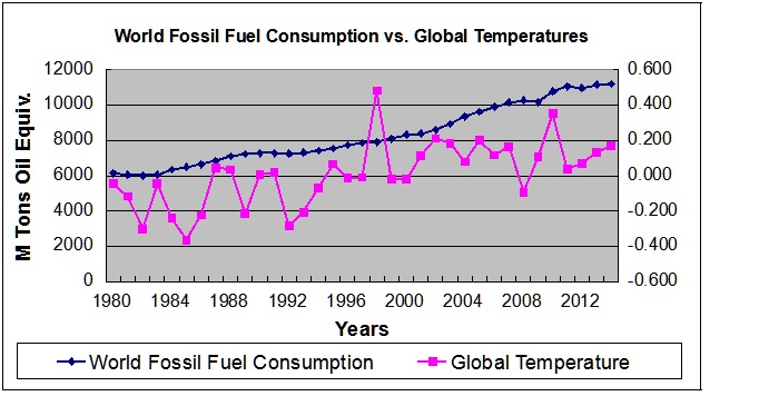 The WFFC numbers come from US EIA and can be accessed here. I have included only the statistics for coal, oil and gas, which comprise 91% of total energy consumed. The remainder are hydro, nuclear and other renewables. 2015 numbers are not yet available. UAH version 6 provides global temperature anomalies for the lower troposphere.