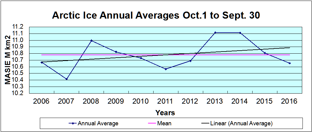 Since we are at the end of the melt season, the chart below takes 12 month averages starting Oct. 1 to display average annual ice extents for the last 11 years.