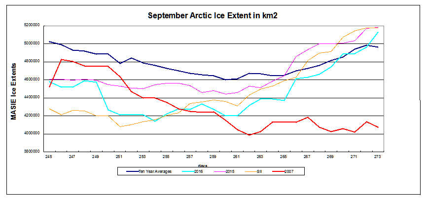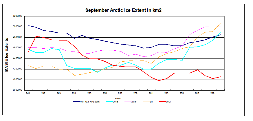 The red line is September 2007, which was the lowest in the last 10 years, except for 2012 which was hit by the great Arctic Cyclone. More importantly, 2007 had the smallest annual average ice extent in the MASIE record (since 2006). The blue line is the ten-year average for days in September (2006 to 2015 inclusive). MASIE 2015 is in purple, MASIE 2016 in green, and 2016 NOAA SII (Sea Ice Index) is in yellow.