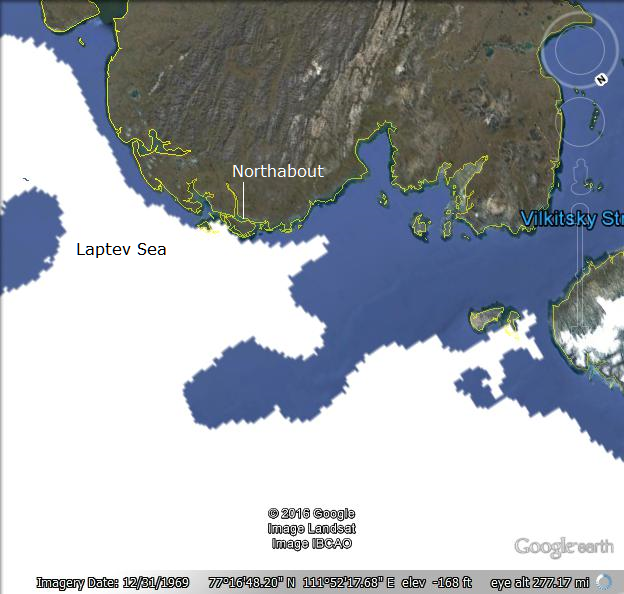It appears that Northabout has found a way around the Laptev wall, and is close to finding open water. Below the Google Earth image of ice edges from NIC shows how the strait has opened up along with navigable shore lines.