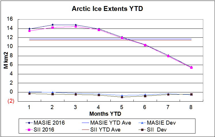 Surpluses in Chukchi and Laptev more than offset deficits in Beaufort and E. Siberian seas. Baffin and Hudson Bays are much lower this year, but they have little left to lose compared to 2015. The most significant issue is Central Arctic being lower than last year, which may yet produce a lower September monthly minimum. Time will tell.