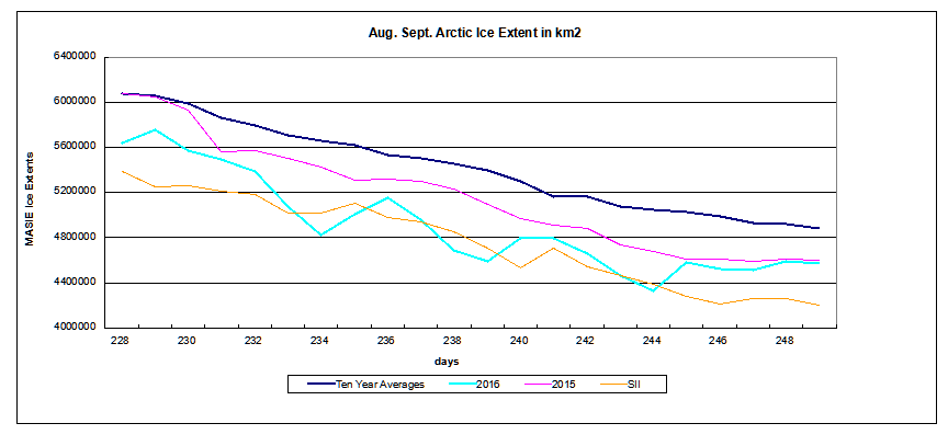 MASIE images of Arctic ice extent show a plateau in ice extent for the first 5 days of September, remaining steadily above 4.5M km2. Day 249 is just 11 days short of the most frequent day of annual minimum. So this is the crunch time in the annual battle between the ocean water and ice. The decline of ice extent is shown below since August 15 (August being the month of greatest loss of ice).