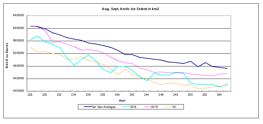 Halfway through September, we can compare extents for day 260, the average day for annual minimums. The table below shows MASIE extents in M km2 on day 260 for significant years in the last decade.