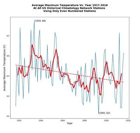 1. “Hotter” does not describe a long period when daily highs are falling, not rising. That’s right, generally the temperature records are showing a decline over time in the maximums recorded at the weather stations.