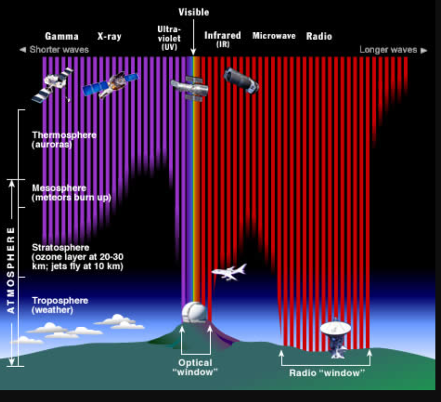 Various wavelengths of solar EM radiation penetrate Earth’s atmosphere to various depths. Fortunately for us, all of the high energy X-rays and most UV is filtered out long before it reaches the ground. Much of the infrared radiation is also absorbed by our atmosphere far above our heads. Most radio waves do make it to the ground, along with a narrow “window” of IR, UV, and visible light frequencies. Credit: Image courtesy STCI/JHU/NASA.