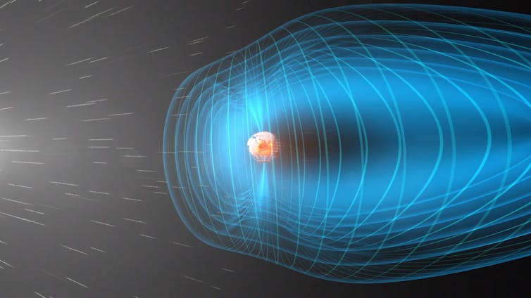 Earth’s magnetic field, in blue, shields the planet from the solar wind. NASA