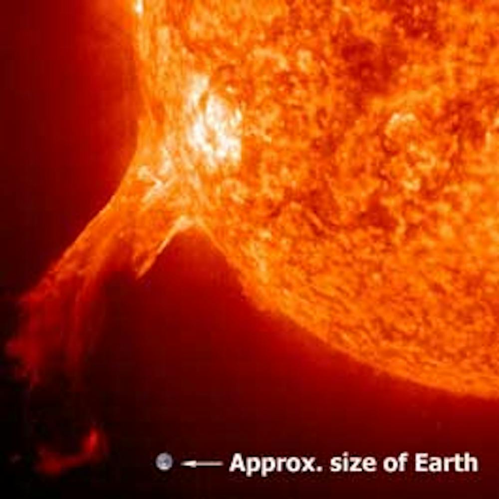 A solar flare (the white patch on the sun), and an erupting prominence reaching into space, are features of our active sun, and place the size of Earth in context. NASA