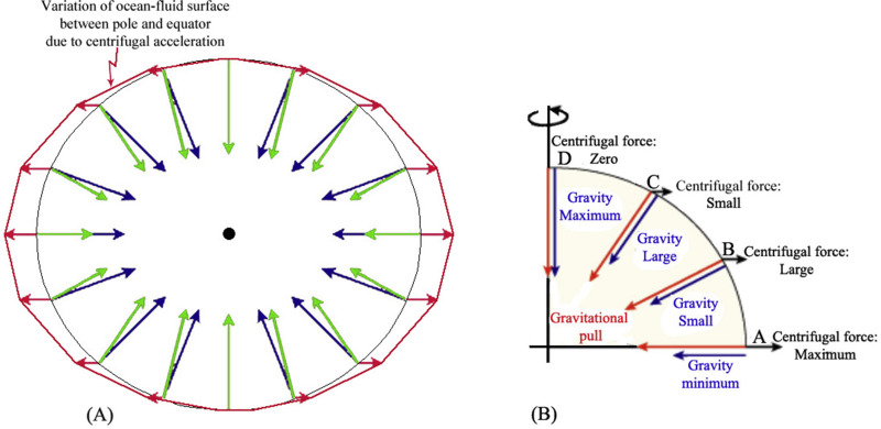 Figure 4. The shape of a sphere by pulling the mass of the earth close to the center of gravity. Blue arrows point from Earth’s surface toward its center. Their lengths represent local gravitational field strength. Gravity is strongest at the poles because they are closest to the center of mass. This difference is enhanced by the increasing density toward the center. Red arrows show the direction and magnitude of the centrifugal effect. On the equator, it is large and straight up. Near the poles, it is small and nearly horizontal. Vector addition of the blue and red arrows gives the net result of gravity plus centrifugal effect. This is shown by the green arrows. Rotation of the earth produces more centrifugal force at the equator, less as latitude increases, and zero at pole.