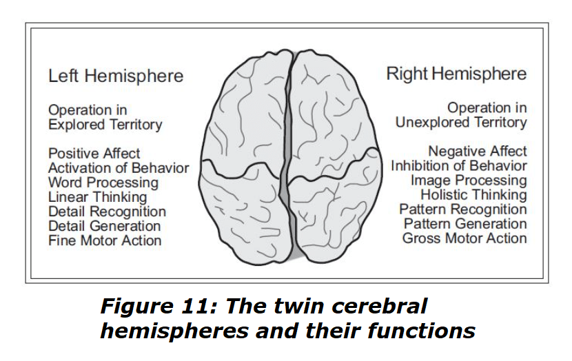 The uniquely specialized capacities of the right hemisphere appear to allow it to derive from repeated observations of behavior images of action patterns that the verbal left can arrange, with increasingly logic and detail, into stories. A story is a map of meaning, a “strategy” for emotional regulation and behavioral output—a description of how to act in a circumstance, to ensure that the circumstance retains its positive motivational salience (or at least has its negative qualities reduced to the greatest possible degree).