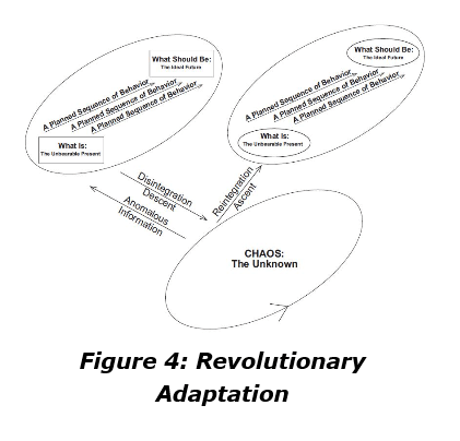[Imagine this predicament] Your encounter with the terrible unknown has shaken the foundations of your worldview. You have been exposed, involuntarily, to the unexpected and revolutionary. Chaos has eaten your soul. This means that your long-term goals have to be reconstructed, and the motivational significance of events in your current environment reevaluated—literally revalued. This capacity for complete revaluation, in the light of new information, is even more particularly human than the aforementioned capability for exploration of the unknown and generation of new information. Sometimes, in the course of our actions, we elicit phenomena whose very existence is impossible, according to our standard methods of construal (which are at base a mode of attributing motivational significance to events). Exploration of these new phenomena, and integration of our findings into our knowledge, occasionally means reconceptualization of that knowledge (and consequent re-exposure to the unknown, no longer inhibited by our mode of classification). This means that simple movement from present to future is occasionally interrupted by a complete breakdown and reformulation, a reconstitution of what the present is and what the future should be. The ascent of the individual, so to speak, is punctuated by periods of dissolution and rebirth. The more general model of human adaptation—conceptualized most simply as steady state, breach, crisis, redress—therefore ends up looking like Figure 4: Revolutionary Adaptation.