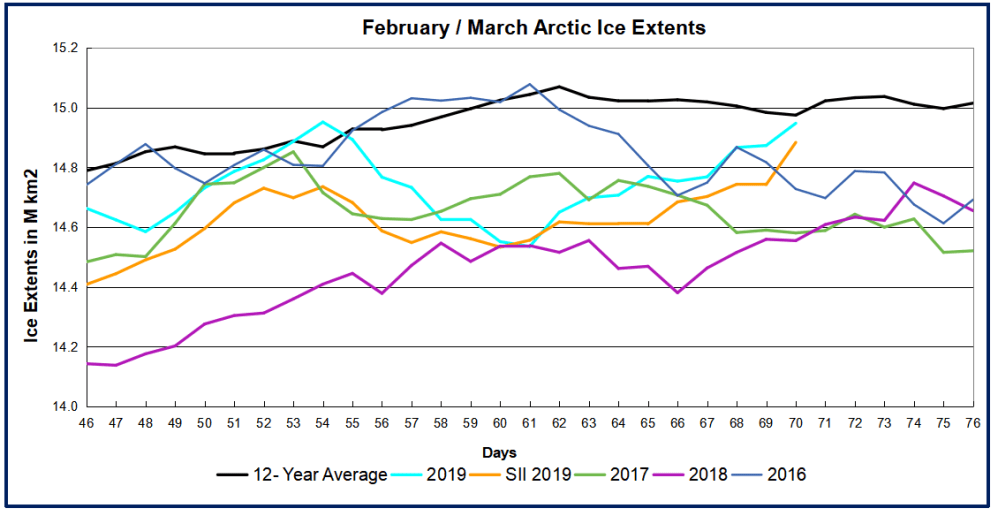 On day 61, March 2, 2016 peaked well above 15M, and did not reach that level again. The graph shows 2017 peaked early and then descended into the Spring melt. 2018 started much lower, gained steadily before peaking on day 74, 250k km2 below average. 2019 has been exceptional, surging early to surpass average on day 54, then declined for a week, before re-surging to virtually tie the average extent on day 70. One final push in the next few days could go over the top.