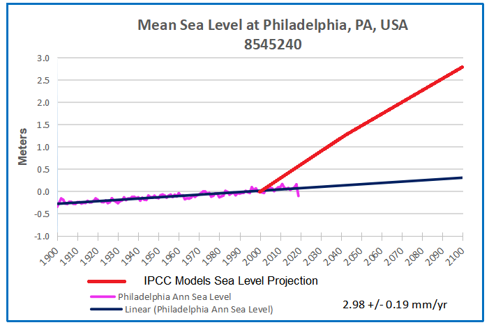 Both the record and projection are zero at year 2000. If the past trend continues, a further rise of 30 cm would be observed by 2100. If Climate Central model-based projection is true, the red line shows 122 cm rise by 2040, and 274 cm by 2100. So alarmists are projecting in 20 years, Philadelphia will get four times the rise that occurred in the last 100 years. Even now, in 2019, the projection is off by 50 cm, and observations are going down.