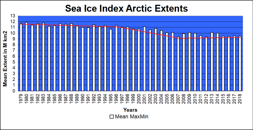 I will use the ever popular NOAA dataset derived from satellite passive microwave sensors. It sometimes understates the ice extents, but everyone refers to it and it is complete from 1979 to 2018. Here’s what NOAA reports (in M km2):