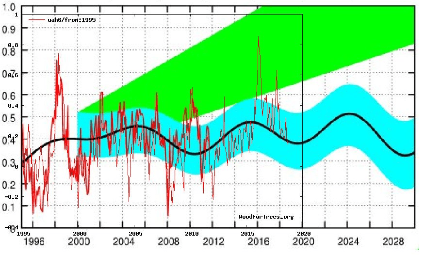 Now again a different pattern appears. The Tropics cool sharply to Jan 11, then rise steadily for 4 years to Jan 15, at which point the most recent major El Nino takes off. But this time in contrast to ’97-’99, the Northern Hemisphere produces peaks every summer pulling up the Global average. In fact, these NH peaks appear every July starting in 2003, growing stronger to produce 3 massive highs in 2014, 15 and 16. NH July 2017 was only slightly lower, and a fifth NH peak still lower in Sept. 2018.