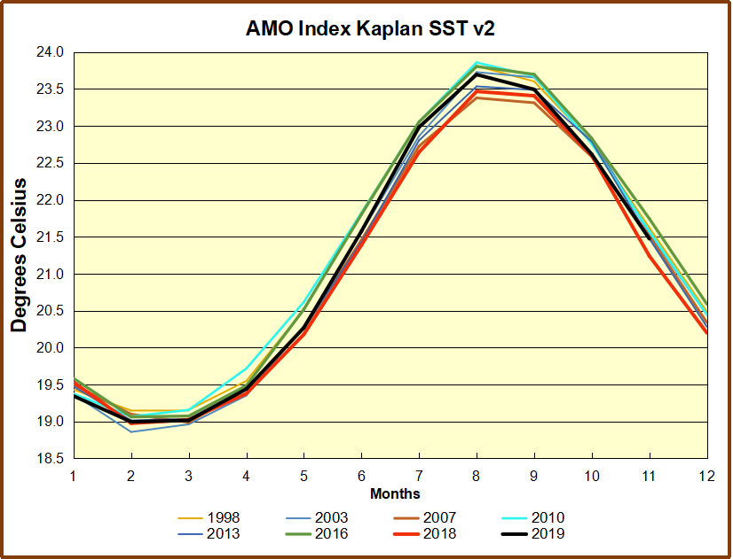 But the peaks coming nearly every summer in HadSST require a different picture. Let’s look at August, the hottest month in the North Atlantic from the Kaplan dataset. The AMO Index is from from Kaplan SST v2, the unaltered and not detrended dataset. By definition, the data are monthly average SSTs interpolated to a 5×5 grid over the North Atlantic basically 0 to 70N. The graph shows warming began after 1992 up to 1998, with a series of matching years since. Because the N. Atlantic has partnered with the Pacific ENSO recently, let’s take a closer look at some AMO years in the last 2 decades. This graph shows monthly AMO temps for some important years. The Peak years were 1998, 2010 and 2016, with the latter emphasized as the most recent. The other years show lesser warming, with 2007 emphasized as the coolest in the last 20 years. Note the red 2018 line is at the bottom of all these tracks. The black line shows that 2019 began slightly cooler, then tracked 2018, then rose to match previous summer pulses, before dropping the last three months to again match 2018 below other years.