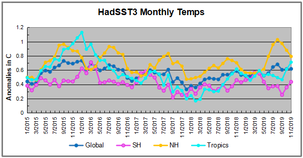 The chart below shows SST monthly anomalies as reported in HadSST3 starting in 2015 through November 2019. A global cooling pattern is seen clearly in the Tropics since its peak in 2016, joined by NH and SH cycling downward since 2016. In 2019 all regions had been converging to reach nearly the same value in April.