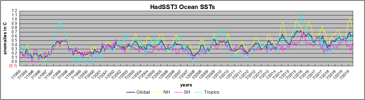 1995 is a reasonable (ENSO neutral) starting point prior to the first El Nino. The sharp Tropical rise peaking in 1998 is dominant in the record, starting Jan. ’97 to pull up SSTs uniformly before returning to the same level Jan. ’99. For the next 2 years, the Tropics stayed down, and the world’s oceans held steady around 0.2C above 1961 to 1990 average.