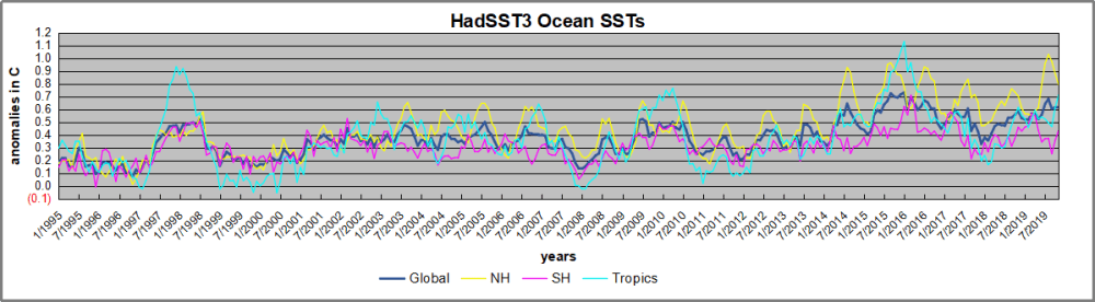 Note that higher temps in 2015 and 2016 were first of all due to a sharp rise in Tropical SST, beginning in March 2015, peaking in January 2016, and steadily declining back below its beginning level. Secondly, the Northern Hemisphere added three bumps on the shoulders of Tropical warming, with peaks in August of each year. A fourth NH bump was lower and peaked in September 2018. As noted above, a fifth peak in August 2019 exceeded the four previous upward bumps in NH.