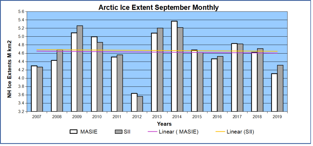 Unwilling to fully call out one its own, Snopes added that “Arctic sea ice is, without question, on a declining trend.” A fact check shows that to be true. A deeper fact check, though, shows that while Arctic sea ice has been falling, Antarctic sea ice has been increasing.