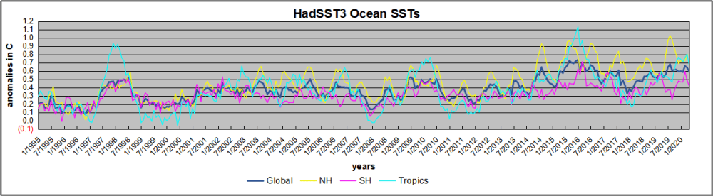 The cool 2020 Spring is not just your local experience, it’s the result of Earth’s ocean cooling off after last summer’s warming in the Northern Hemisphere.  The chart below shows SST monthly anomalies as reported in HadSST3 starting in 2015 through May 2020.