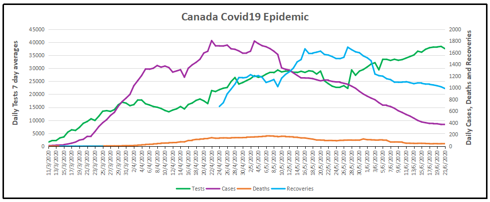 In reporting on Covid19 pandemic, governments have provided information intended to frighten the public into compliance with orders constraining freedom of movement and activity. Statistics of interest to the public have been hidden; for example only cumulative numbers are presented to show ever increasing cases and deaths. For example, the above map of the Canadian experience is all cumulative, and the curve will continue upward as long as cases can be found and deaths attributed. As shown below, we can work around this myopia by calculating the daily differentials, and then averaging newly reported cases and deaths by seven days to smooth out lumps in the data processing by institutions.