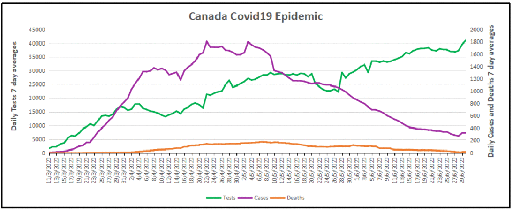 The Quebec graph is more lumpy showing cases peaking May 1-9, including several days inflated by data catchups. Cases have dropped off recently, from 1100 May 7 down to 82 yesterday. Deaths are also slowing, declining from 110 on May 7 to 11 on June 30. The animation below shows the epidemic in Canada with and without Quebec statistics.