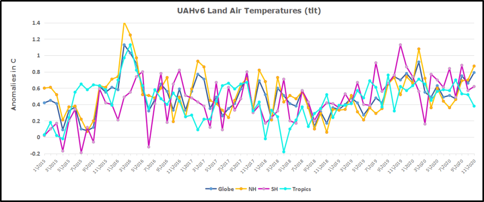 We sometimes overlook that in climate temperature records, while the oceans are measured directly with SSTs, land temps are measured only indirectly.  The land temperature records at surface stations sample air temps at 2 meters above ground.  UAH gives tlt anomalies for air over land separately from ocean air temps.  The graph updated for November 2020 is below.