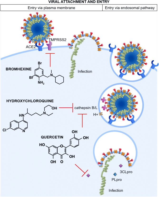 - Bromhexine (a mucolytic cough medication) inhibits the expression of cellular TMPRSS2 protease and thus the entry of the virus into the cell, as first described in 2017.