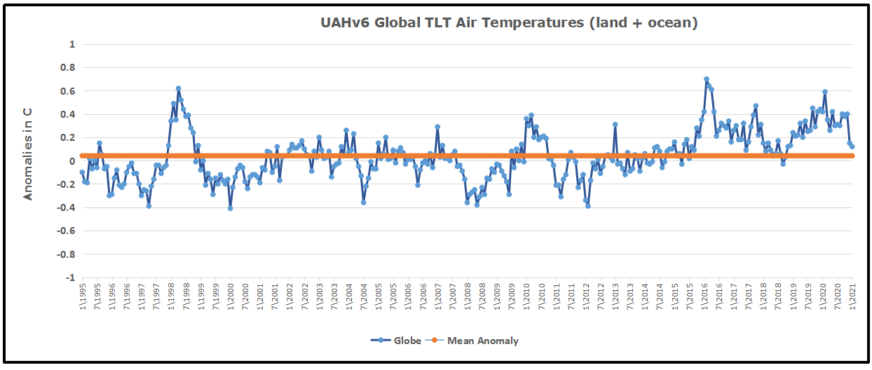 Note:  UAH has shifted their baseline from 1981-2010 to 1991-2020 beginning with January 2021.  In the charts below, the trends and fluctuations remain the same but the anomaly values change with the baseline reference shift.