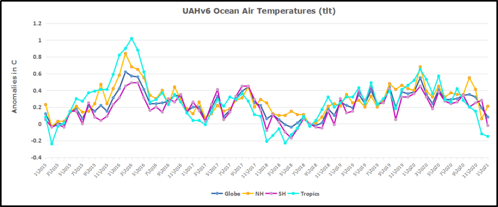 Note 2020 was warmed mainly by a spike in February in all regions, and secondarily by an October spike in NH alone. End of 2020 November and December ocean temps plummeted in NH and the Tropics. In January SH dropped sharply, pulling the Global anomaly down despite an upward bump in NH. Both SH and the Tropics are now as cold as any time in the last five years, and all regions are comparable to to 2015 prior to the 2016 El Nino event.