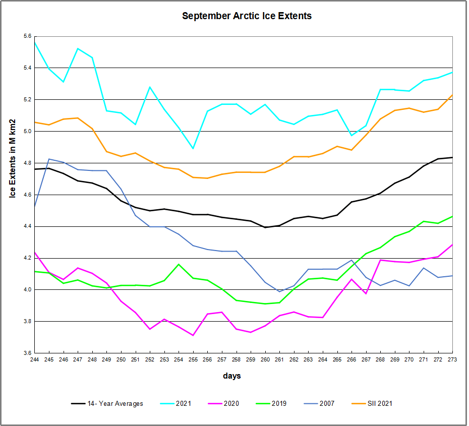 September daily extents are now fully reported and the 2021 September monthly results can be compared with those of the previous 14 years. MASIE showed 2021 at 5.2M km2 and SII was close behind, reaching 4.9M for the month. Analysis below shows that the 2021 Minimum was 1/2 Wadham ( 1M km2) higher than the 14 year average, and 1¼ Wadhams more than 2007