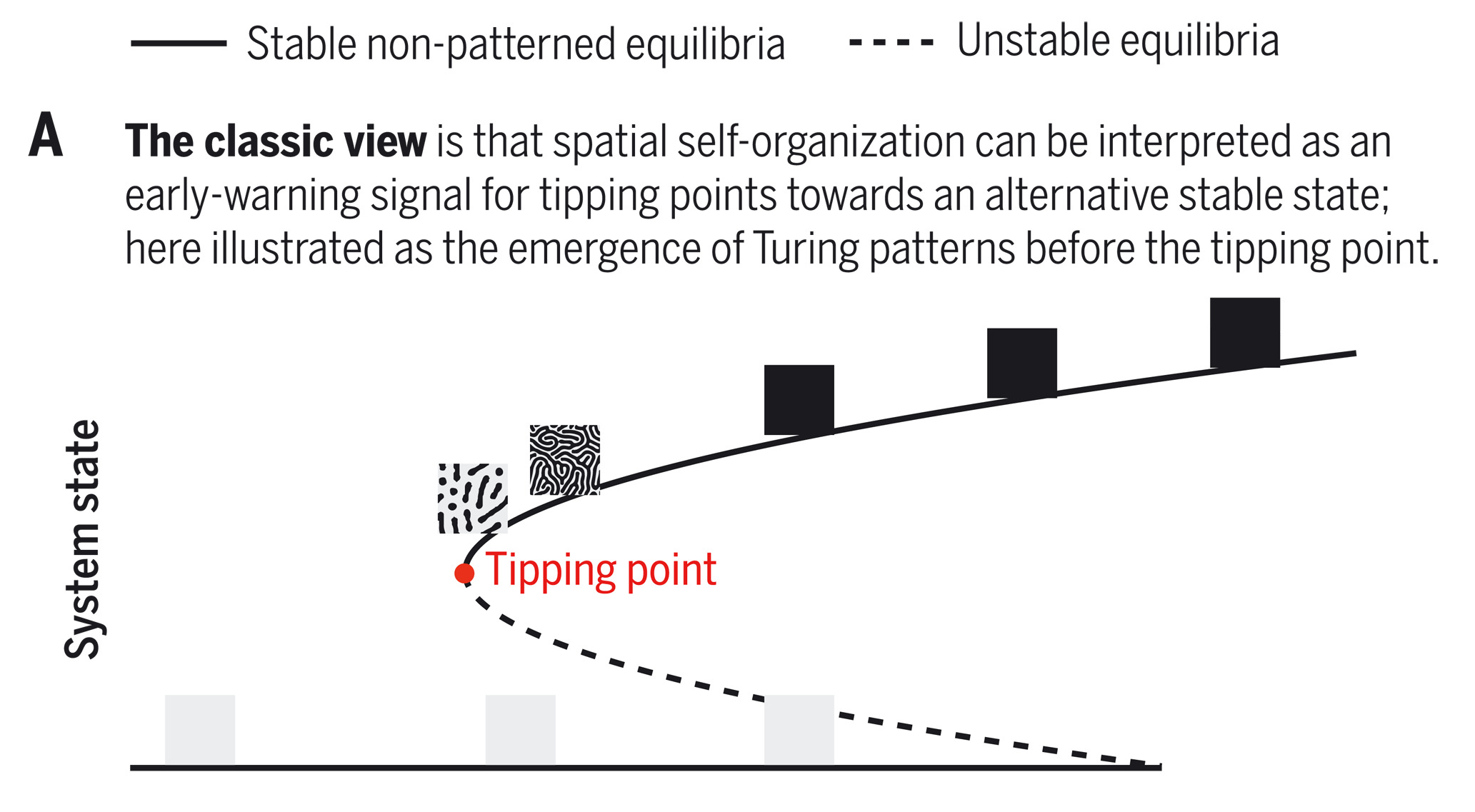 The above diagram from the study shows the tipping point paradigm accepted by the authors as a foundation for discovering how ecosystems are sometimes able to evade tipping over from a present state. It is heartening that the authors refer to the resilience of ecosystems and say that observed ecological disturbances are in fact evidence of natural stability, not fragility.