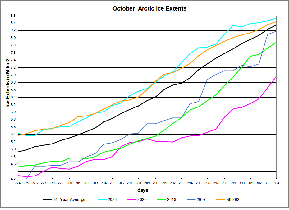 The black line shows during October on average Arctic ice extents increase ~3.4M km2 from ~4.9M km2 up to ~8.3M km2. The 2021 cyan MASIE line started the month ~500k km2 above average and on day 304 retained a surplus of ~160k km2. The Sea Ice Index in orange (SII from NOAA) started with the same deficit, then lagged behind in the last two weeks, before ending ~100k km2 lower than MASIE. 2019 and 2020 were well below average at this stage of the ice recovery.