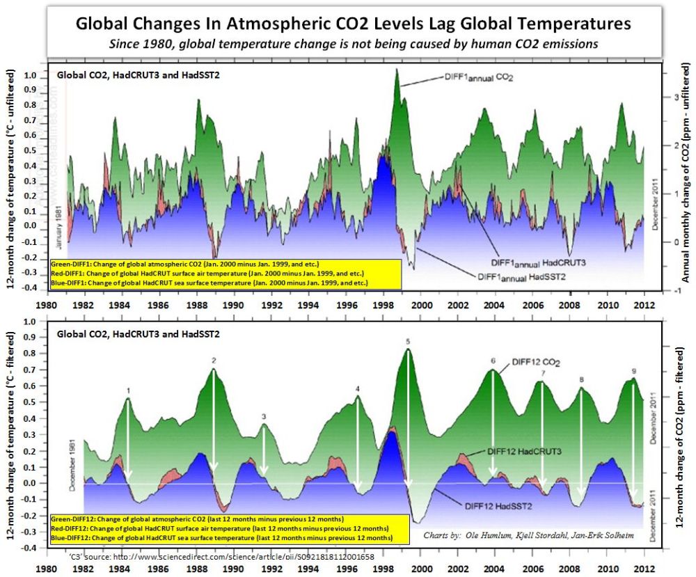 Humlum et al. looks the modern record of fluctuating temperatures and atmospheric CO2 and concludes that CO2 changes follow temperature changes over these timescales. The paper is The phase relation between atmospheric carbon dioxide and global temperature OleHumlum, KjellStordahl, Jan-ErikSolheim. Excerpts with my bolds.