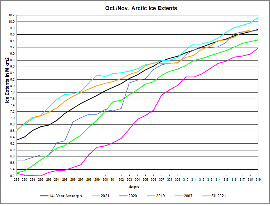 The black line shows during this period on average Arctic ice extents increase ~3.5M km2 from ~6.3M km2 up to ~9.8M km2. The 2021 cyan MASIE line started the period ~400k km2 above average and on day 319 retained a surplus of ~380k km2. The Sea Ice Index in orange (SII from NOAA) started with the same deficit, then lagged behind in the first two weeks, before ending ~200k km2 lower than MASIE (no data yet for yesterday). 2019 and 2020 were well below average at this stage of the ice recovery.