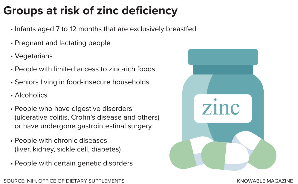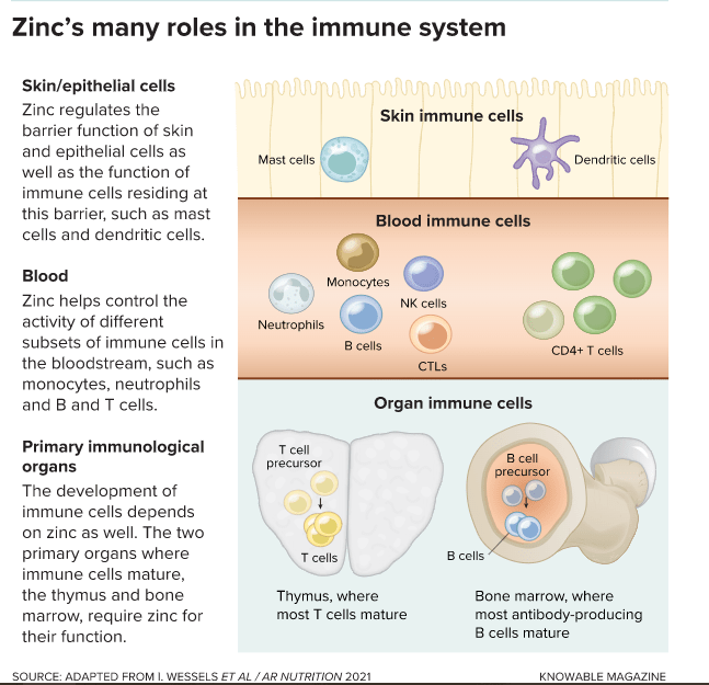 Studies show that zinc is important in almost all aspects of the immune system: It helps skin cells and cells lining our organs prevent pathogens from entering, and it keeps the thymus and bone marrow, which are responsible for generating immune cells, functioning normally. Zinc “crops up in all parts of the immune system,” says Sophie Hambleton, an immunologist at Newcastle University in the UK — and zinc-deficient people show a wide range of immune dysfunctions.