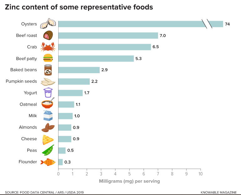 For these reasons, although it is possible to detect zinc levels in blood, these measurements are often imprecise. And unlike iron, which is easily assessed by measuring levels of iron-containing blood proteins like hemoglobin and ferritin, there is no biomarker that can be used as an indicator of zinc levels. “There’s still no 100 percent accurate way to measure zinc in a human being, especially if they have an illness of some kind,” says Daren Knoell, a zinc biologist at the University of Nebraska. Currently, the best way to determine a potential zinc deficit is to look at someone’s dietary intake, he adds.