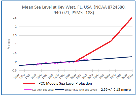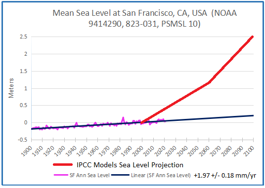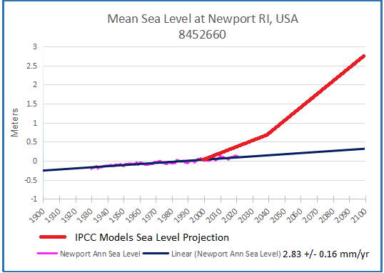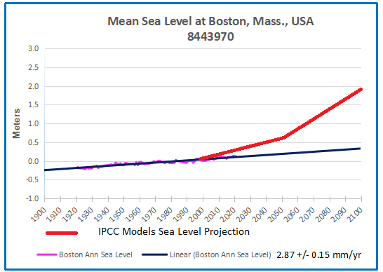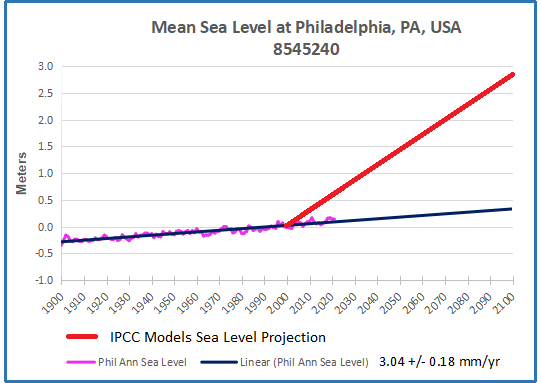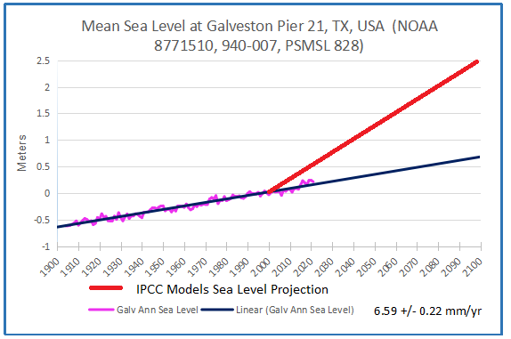 Already the imaginary rises are diverging greatly from observations, yet the chorus of alarm goes on. In fact, the added rise to 2100 from tidal gauges ranges from 6 to 9.5 inches, except for Galveston projecting 20.6 inches. Meanwhile models imagined rises from 69 to 108 inches. Clearly coastal settlements must adapt to evolving conditions, but also need reasonable rather than fearful forecasts for planning purposes.