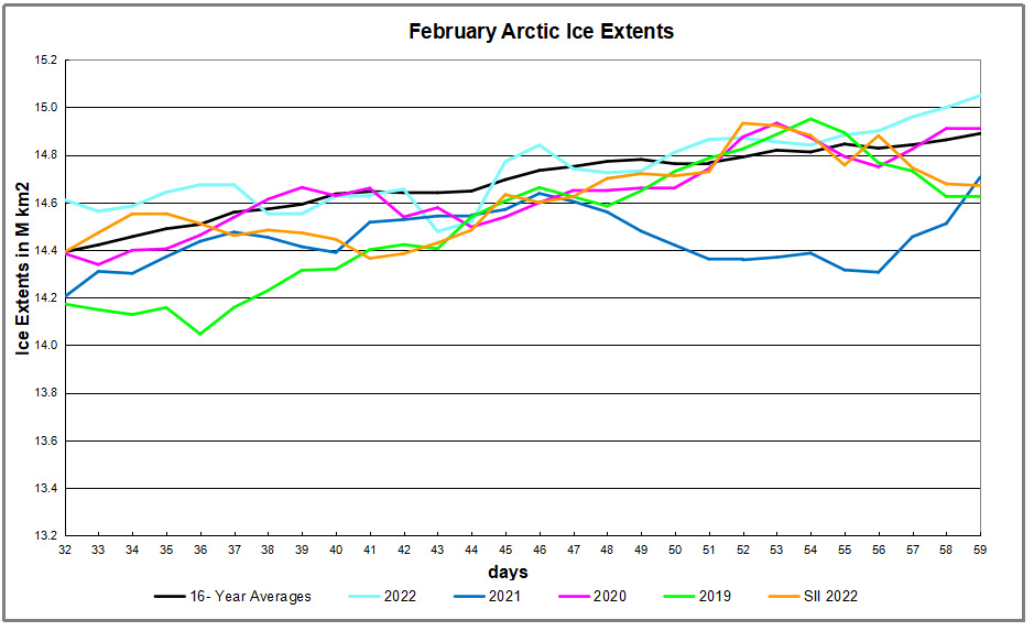 The next two weeks will be interesting. The average year in the last sixteen gained about 100k km2 from now to mid March. But the variability ranged from 2015 losing 300K while some other years gained 400k km2. And since 2016, only 2020 broke the 15M km2 ceiling. What will the ice do this year?