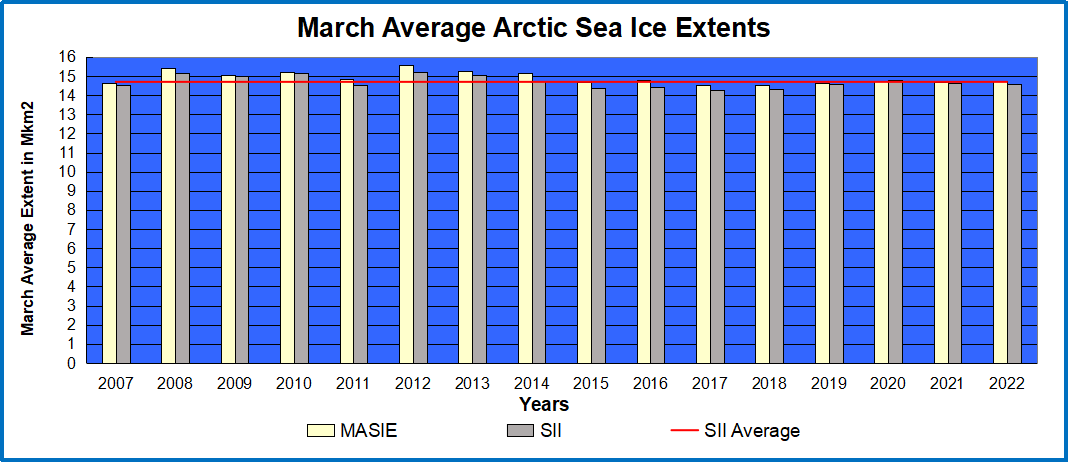 Previous posts showed 2022 Arctic Ice broke the 15M km2 ceiling in February, followed by a typical small melt in March. Climatology refers to the March monthly average ice extent as indicative of the annual maximum Arctic ice extent. The graph above shows that the March monthly average has varied little since 2007, typically around the SII average of 14.7 M km2. Of course there are regional differences as described later on.