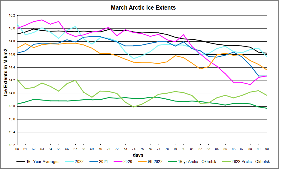 The graph above shows ice extent through March comparing 2022 MASIE reports with the 16-year average, other recent years and with SII. Hovering around 15M km2 the first week, 2022 ice extents dropped sharply mid month, then stabilized and at March end matched the average. Both 2020 and 2021 ended nearly 400k km2 below average. The two green lines at the bottom show average and 2022 extents when Okhotsk ice is excluded. On this basis 2022 Arctic was nearly 400k km2 in surplus, then declined mid month before ending nearly 200k km2 in surplus to average, except for the ice shortage in Okhotsk.