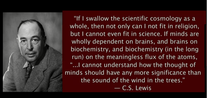 PR: Earlier you talked about values and how we see the world through values so here’s a question. If there’s no objective standard of reason outside and above ourselves, if everything is just matter how we think, how can we do science? What do you think of this from C.S. Lewis: If I swallow the scientific cosmology as a whole, meaning all that exists is only what we can perceive through our senses, then not only can I not fit in religion, I cannot even fit in science. If minds are wholly dependent on brains, and brains on biochemistry, and biochemistry in the long run on the meaningless flux of the atoms, how the thoughts of minds have any more significance than the sound of the wind in the trees?