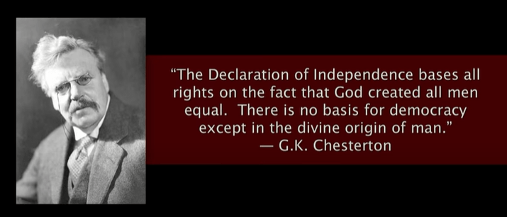 PR: From science to to politics to quotations. Jordan Peterson this is a tweet of just last month: Does anything other than the axiomatic acceptance of the divine value of the individual make slavery a self-evident rule, right? That’s a good one. I’m going to put you in an august company. Here’s G.K. Chesterton: The declaration of independence bases all rights on the fact that god created all men equal. There is no basis for democracy except in the divine origin of man so these are very similar thoughts.