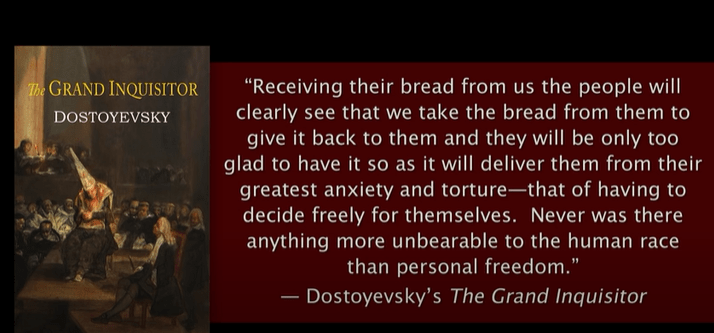 The question is: How much proof do we need and why do we still avert our eyes from the truth? Why why do we still feel tempted. Dostoyevsky in the legend of the grand inquisitor has the grand inquisitor speaking to Christ and he says to Christ: You’re all wrong. Receiving their bread from us the people will clearly see that we take the bread from them to give it back to them. And they will be only too glad to have it so long as we will deliver them from their greatest anxiety and torture: that of having to decide freely for themselves. Never was there anything more unbearable to the human race than personal freedom.”