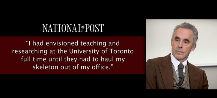 PR: Coming back to Canadian universities Jordan Peterson was quoted in the National Post this past march: “I had envisioned teaching and researching at the University of Toronto full-time until they had to haul my skeleton out of my office.” Instead you retired. Why?
