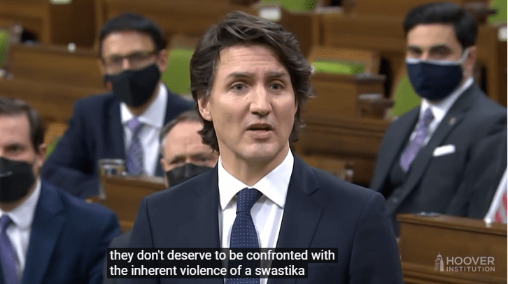 Now the clip of PM Trudeau speaking in parliament: “It has to stop. The people of Ottawa don’t deserve to be harassed in their own neighborhoods. They don’t deserve to be confronted with the inherent violence of a swastika flying on a street corner, or a confederate flag, or the insults and jeers just because they’re wearing a mask. That’s not who Canada, who Canadians are.”