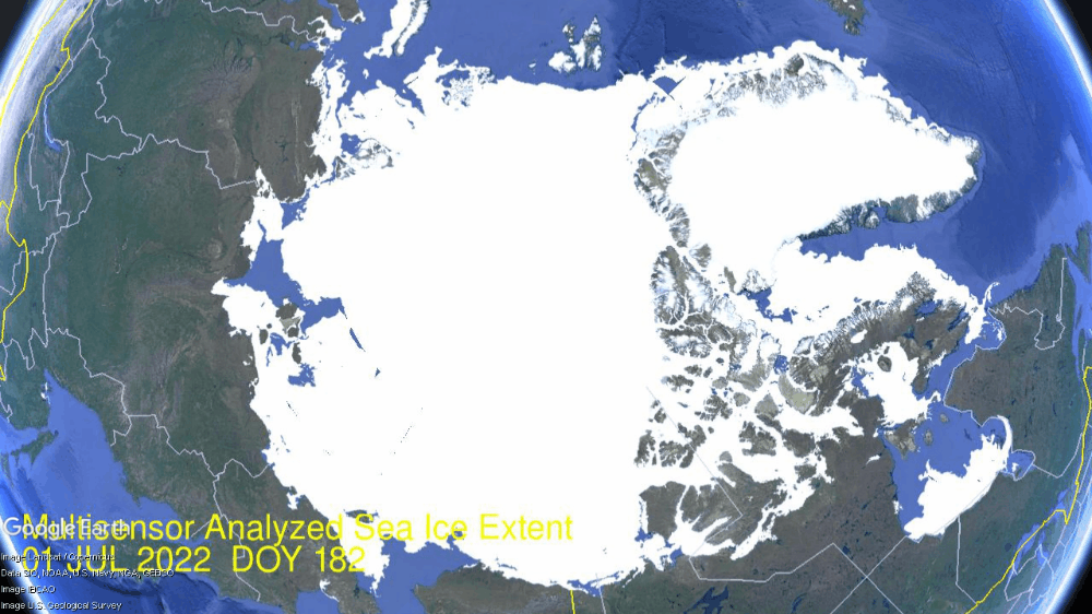 The image above shows melting of Arctic sea ice extent over the first half of July 2022. As usual, on the extreme left of the image, the Pacific basins of Bering and Okhotsk seas are entirely open water. Meanwhile on the lower far right, Hudson Bay ice retreats from 600k km2 to 300k km2 from north to south. Note center right Hudson Strait opens up between Hudson Bay and Baffin Bay. At the top center Barents Sea is mostly open water, while Kara Sea upper left lost 200k km2 down to 29% of its last max. Center left Laptev has melted somewhat, but still retains 63% of its maximum ice extent. The central mass of Arctic ice is intact with some fluctuations back and forth, and as well as Beaufort Sea and CAA (Canadian Arctic Archipelago) were slow to melt in July, retaining 91% of maximum ice in each basin.