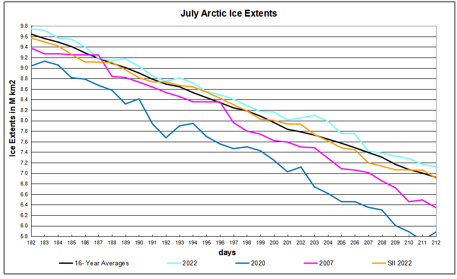 The animation shows Arctic ice extents on day 212 (end of July) starting with 2007, and showing the lack of decline through yesterday. Years vary as to which regions retain more or less ice. For example, some years the Russian shelf seas (left side) are mostly open water on day 212. Kara and Barents seas (top side) fluctuate. The Northwest passage (bottom), melts early some years in Beaufort Sea, and CAA, but this year not so much. The graph below compares the July monthly ice extents 2007 to 2022 and compared to the SII 16 year average.
